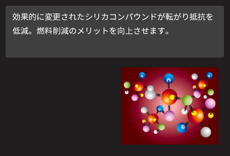 進化しつづける、人にも地球にもやさしいエコタイヤ。ドライビング性能と静粛性を両立しながら、ウェットな路面でも転がり抵抗を減らすとともに、ロードノイズも軽減しています。
