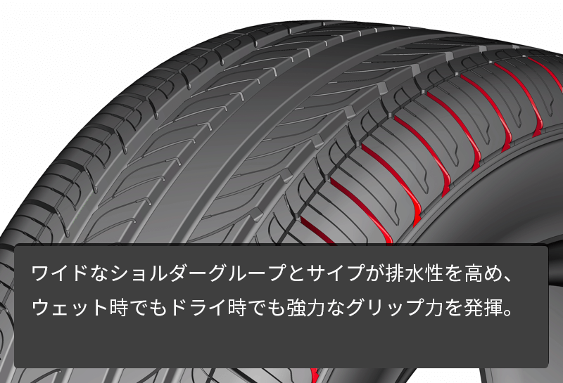 - ワイドに刻んだショルダーサイプとタイヤ溝が排水性を高め、ウェット時でもドライ時でも強力なグリップ力を発揮。